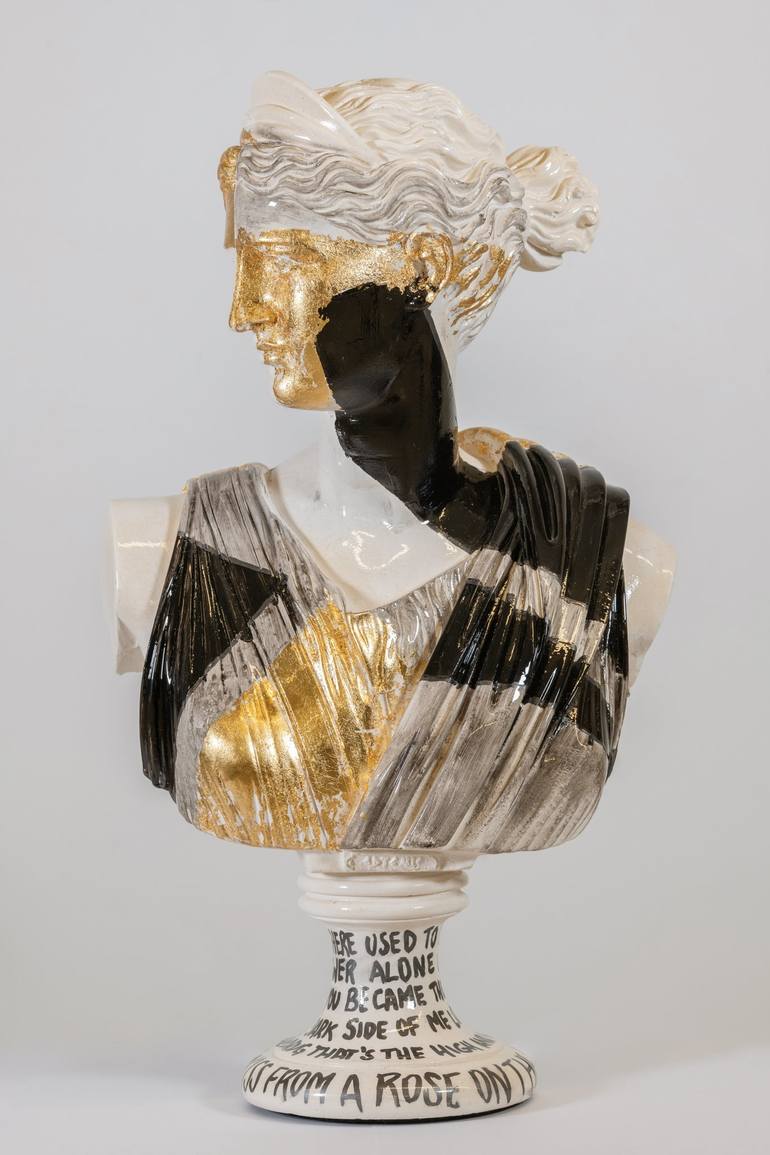 Medium: Alabaster sculpture, Acrylic, Gold Leafs Size: 32H x 47W Color: White, Black, Gold Signed: handwritten signature 100% made in Greece