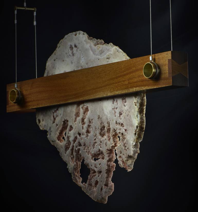 A pink amethyst slab confined between two dove-tailed Mahogany boards and suspended by a brass pipe and steel wire rig. A fine balance between the built world and the natural world. An alignment that some may see as balanced and be taken for granted without conscious thought, while for others it ma...