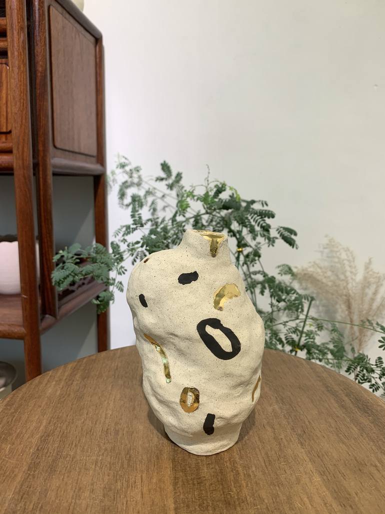 The art work is hand made pottery (glazed), painted in ink and gold, baked in an electric ceramic kiln over 1250 celsius.