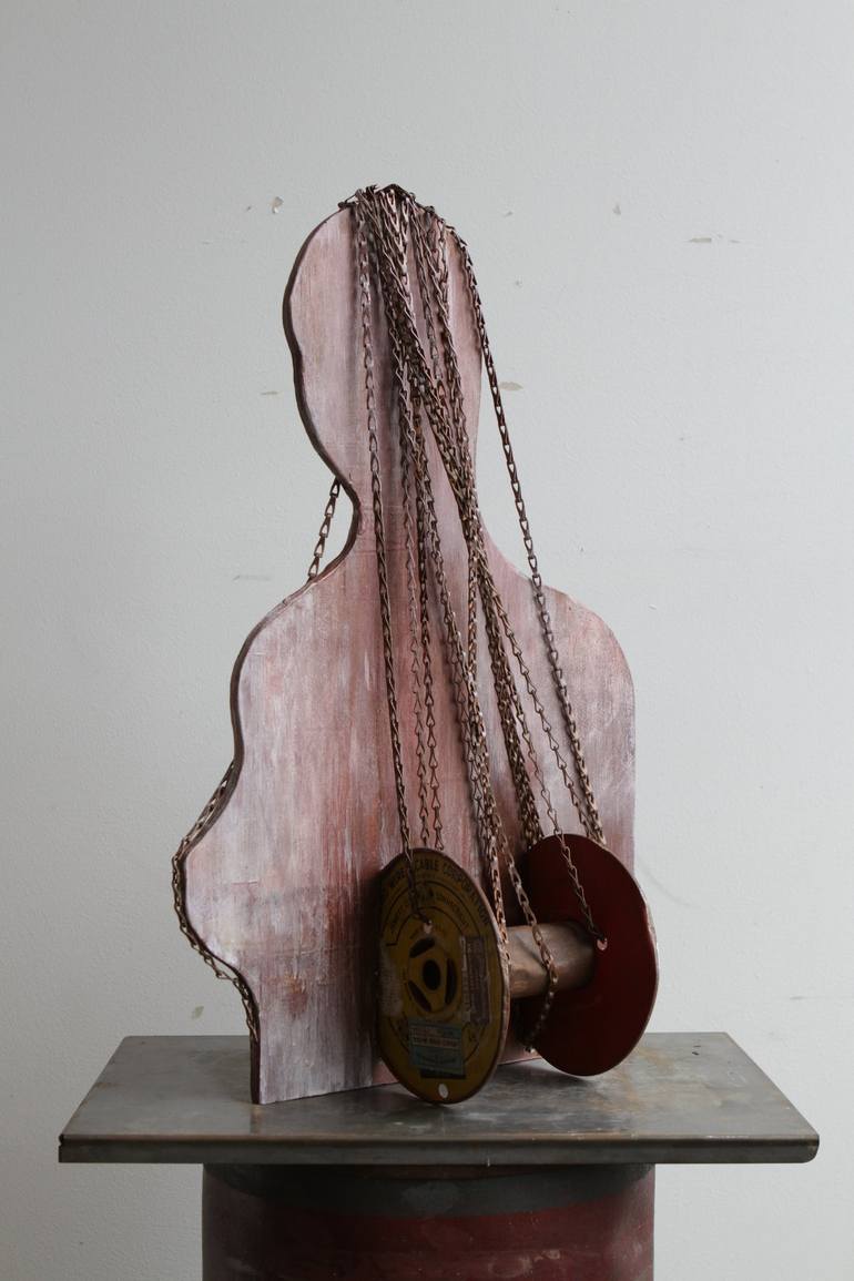 The female silhouette stands by herself, mounted on the base and supported by a chain spool that has its original stickers on. The chain from the same (1950's spool as the granddaughter of the storage-garage suspected) ties the female torso and the spool together and forms the hair of the woman. Her...