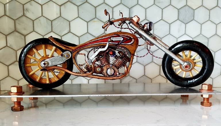 This is a sculpture that was made with the owner of the tool shop in mind. The frame is one piece of hand carved oak with copper and aluminum parts. I can make replicas of any bike or car on request.