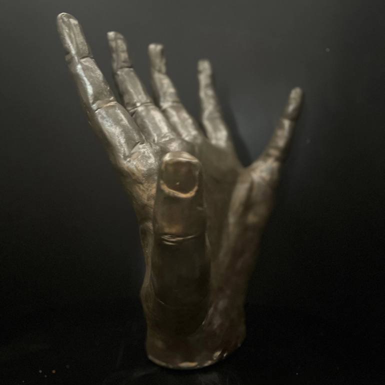 Inspired by the early stages of AI were 6 fingers was the normal. Emphasizing the beauty of the imperfection, one of 8 experiments trying to create a realistic hand, with all his expressions. Made with highfire stoneware and covered with a metal gold glaze.