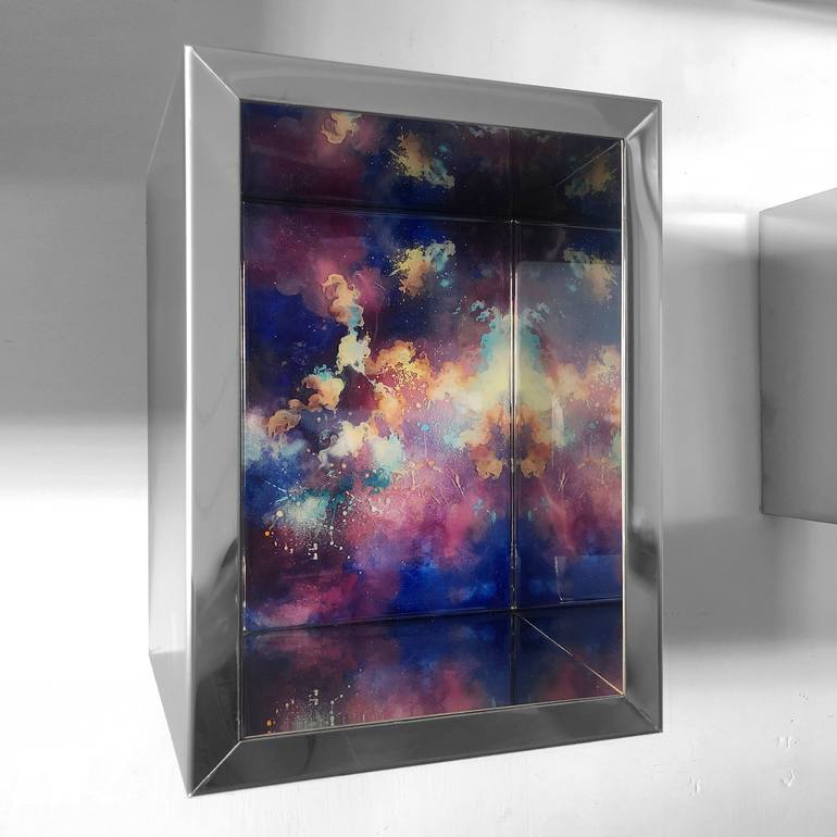Anima 9 is a wall sculpture created in 2019 for a site specific installation within the artist's solo exhibition. work made of stainless steel, wood and resin consists of a steel box where inside there is a pictorial work made with mixed techniques and resin and is reflected infinitely inside the bo...