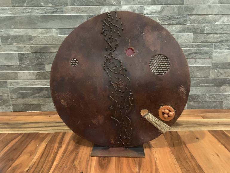 For sale is a recently completed abstract metal art piece. Materials used include 18 gauge sheet metal with stained glass jewel, twine, ball bearings, washer and expanded steel as accents. The piece was rusted using hydrogen peroxide, vinegar and salt mix. Following rust process the entire piece wa...