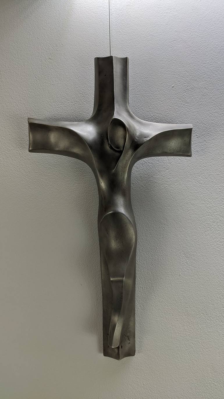 "Abstract Wall Crucifix" is a modern metal sculpture that reimagines the traditional crucifix with clean, flowing lines and a minimalist design. Designed to be mounted on a wall, the artwork balances simplicity and elegance, allowing the crucifix form to shine in a all its glory. This piece was ins...