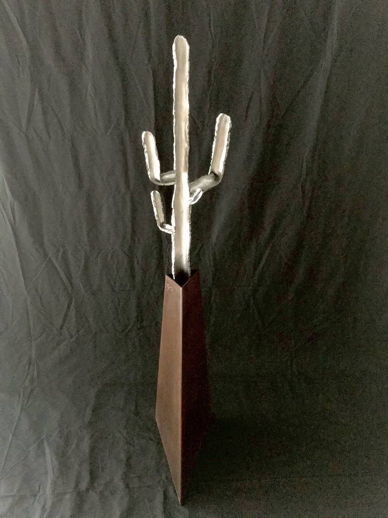 The sculpture represents a cactus plant, specifically a Saguaro Cactus. The plant is made entirely of stainless steel and then polished, it rests on a destructured polygon in corten steel that acts as a vase. The irregular lines that naturally delineate the catus plant are here faithfully interprete...