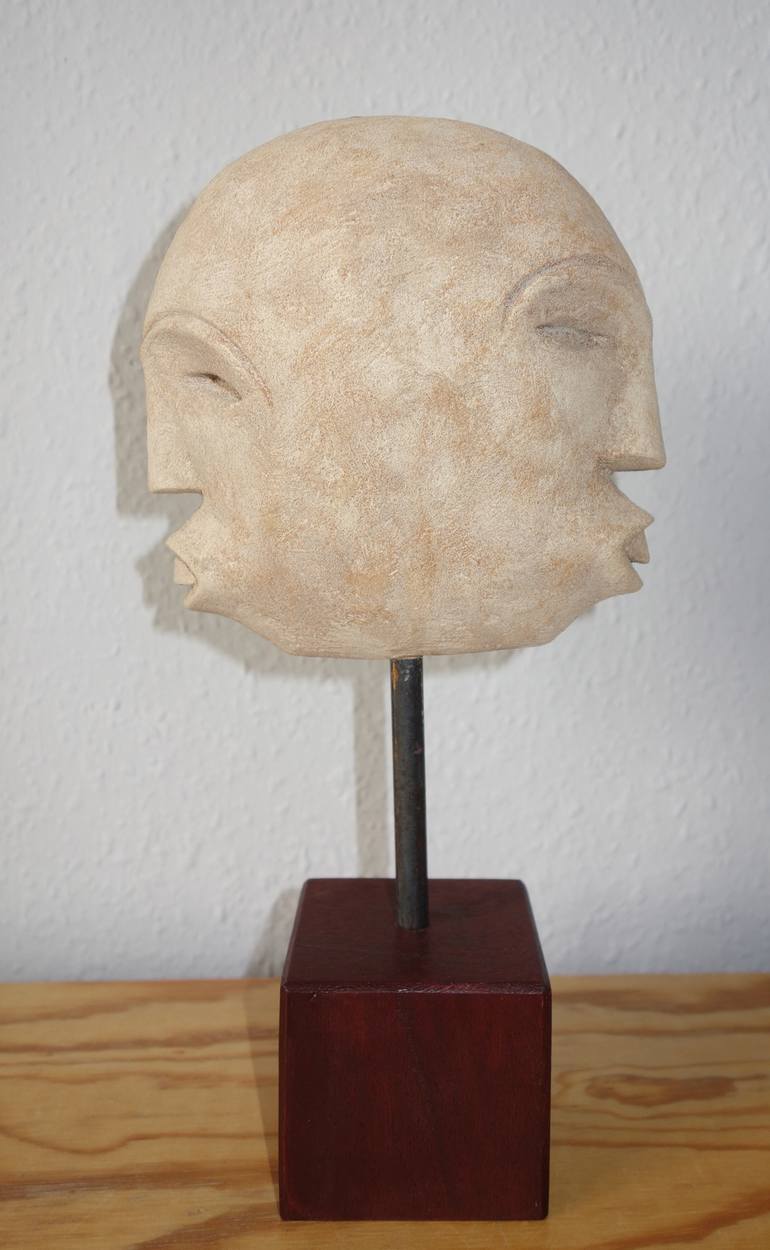 An old African mask was moulded twice and assembled together as one figure, back of the head to back of the head and faces looking in opposite directions. The Greek God Janus is about beginnings, gates, transitions, time - quintessentials of African society. Also, is it about only looking forward, ...