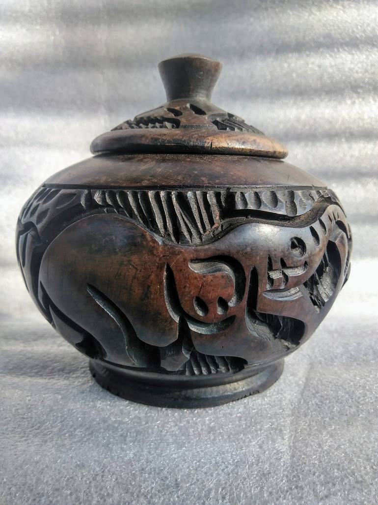 This blackwood African sculpture, in addition to being a artwork for daily use, is also a luxury sculpture, due to its rarity and the commercial value of the wood. Fauna and Flora of Wild Africa are represented here by the most emblematic African animals, the elephant and the rhinoceros, as well as ...