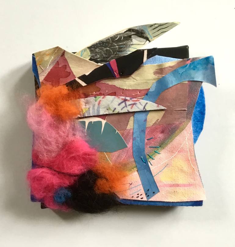 This artwork is a sculptural painting. I use layers of organic-shaped materials in mixed media including acrylic, fabric, dyes, stitching, wool, watercolor and digital printing on substrates of canvas, silk, archival foam core and paper.The richly contrasting textures of fabric, paper, painted surfa...