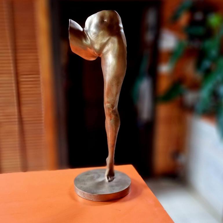 An elegant figurine of a woman's slender leg cast in solid bronze. The sculpture has been left open at the back thus showing how all bronze sculptures are made, hollow. It has been modelled digitally from the life pose of a life model. The digital file has been 3D printed in resin. A silicon rubber...