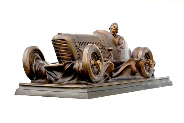 Art-Deco dust flies around this large dramatic sculpture as legendary driver Frank Lockhart steers his Miller 183 through a corner. “American Racer” is proudly old fashioned, inspired by the 1920’s “Richfield Racer.” In 1920 Harry Miller built his first straight eight engine a 183 cubic double overh...