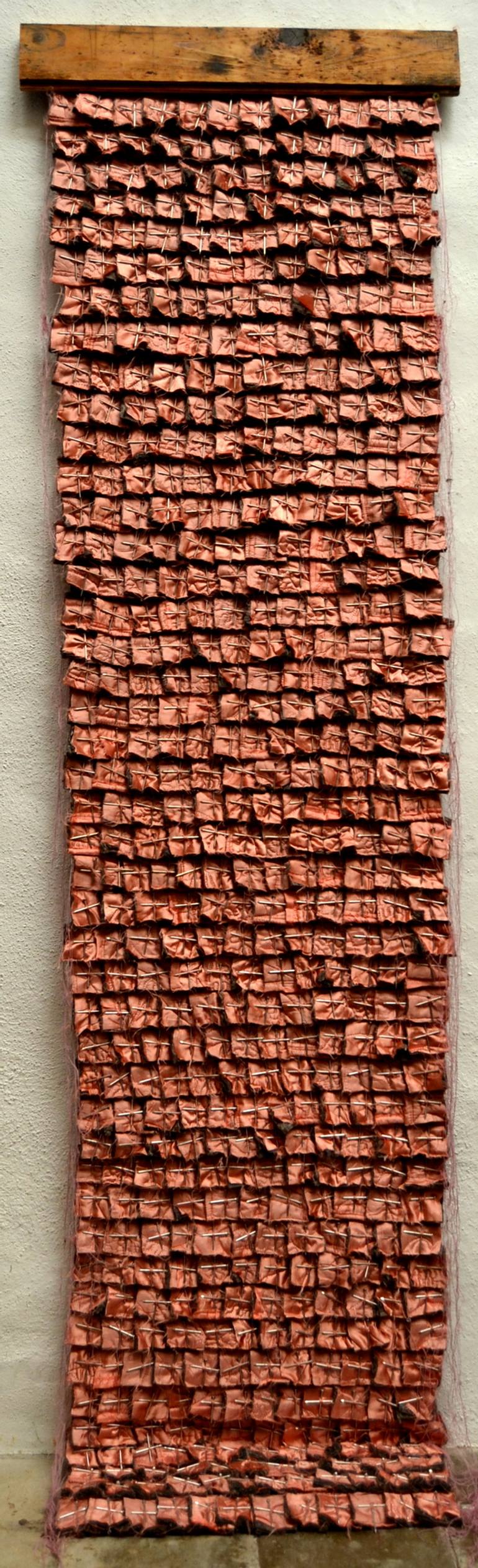 This wall based sculpture is part of a 12 piece installation. The work is created from the deconstruction and re-contextualising of an old 1950's quilt. Built up methodically and embellished repeatedly with tacks to create cross forms. The artwork ships in a secure cardboard box (NOT crate), the ...