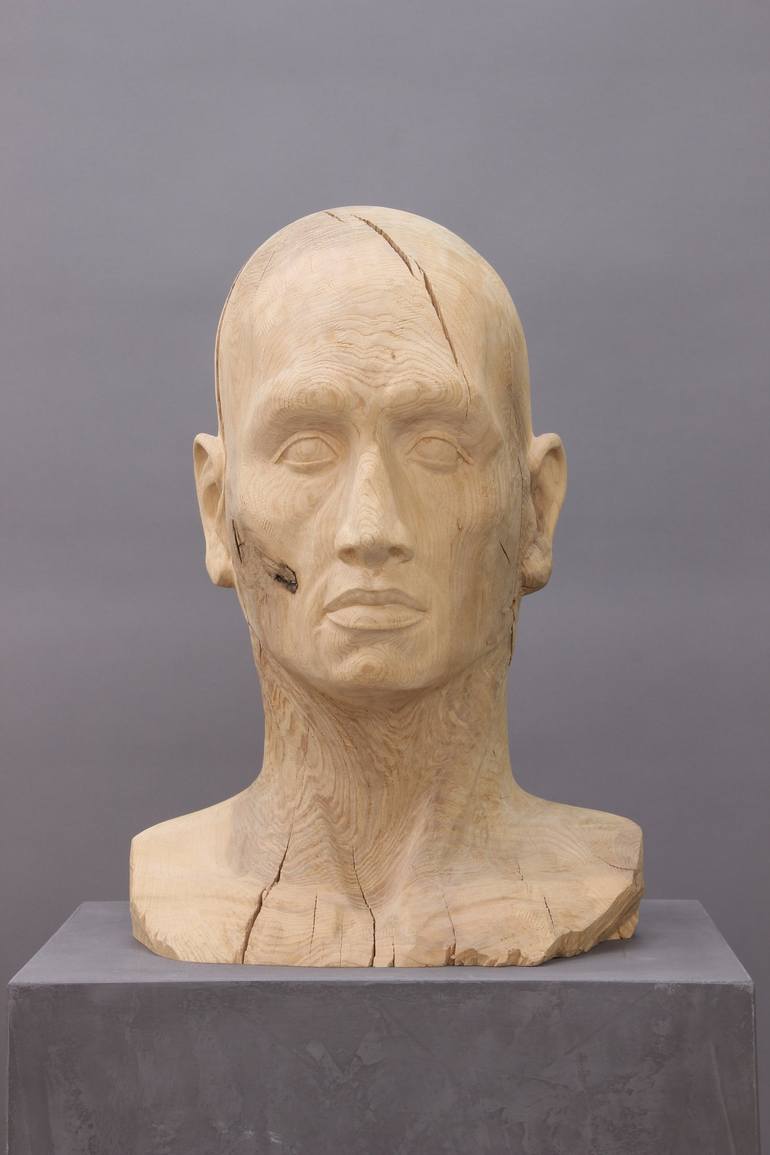 The sculpture "Aufriss" was made of ash wood. Deliberate confrontation of the finished sculpture by deliberate, induced heat, created enormous cracks on the bust, which additionally breathe even more life and character. Additional base in concrete look available on request. Dimensions head: Heig...