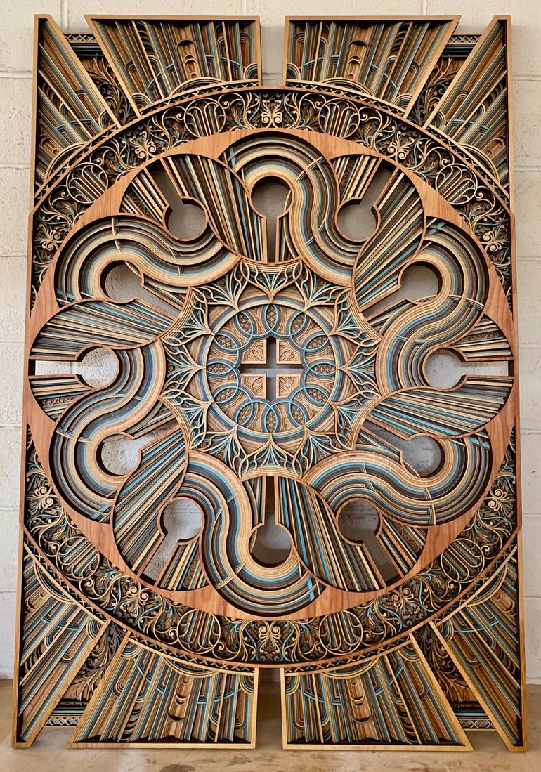 Working principally in laser-cut plywood, Oakland-based artist Gabriel Schama creates densely layered forms that twist, intersect, and overlap to create compositions that are precise and expressionist. Although the design process begins digitally with complex vector illustrations, Schama’s work is brought to life by the artist’s meticulous craftsmanship. His years of experience in high-end architectural metalwork and furniture design are as evident in the impeccable construction of his work, as they are in the delicate balance of the design. His work meanders amongst purely abstract pseudo-mandalas, silhouetted figures and portraits, architectural landscapes, and typographic studies. Rendered in mixed tones of wood grain or in vivid blocks of color, endless details hide in the crevices of Schama’s work, rewarding repeated and up-close scrutiny, even as the overall arrangement defies a single visual interpretation, shifting with each change in perspective.