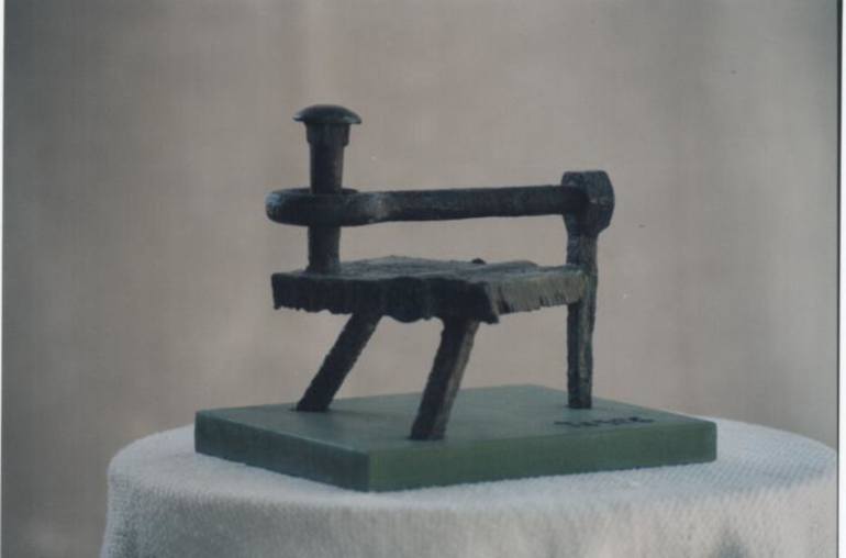 Escultura en hierro forjado y soldado con tratamientos de policromía y pátinas. Cumple la premisa de poder prescindir de la base de madera coloreada, cuando se desee. Es la lra. de una serie de 5 piezas que llevan el mismo nombre y número correlativo.