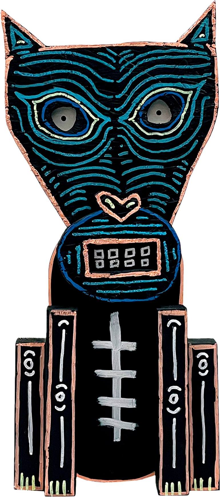 BILLIE THE CAT by Frank Willems. Video: https://www.youtube.com/shorts/1t2Hp0wzBmc Year: 2023 Size: 28 x 67 x 21 cm Materials: Acrylic, marker, spray paint on reused wood By day, tranquility reigns in PUSSY CAT PALACE. The cats lie relaxed in their colorful surroundings, seemingly carefree. But a...