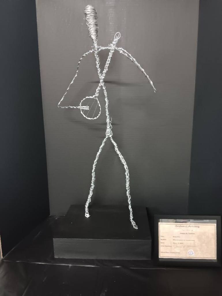 Original Mounted on display pedestal, Banjo Man is an original wire sculpture of a man catching a fish on a wooden base. Silver and Black it is 31 inches tall x 12 inches wide x 8 inches deep. Comes with Certificate of Authenticity. Inspired by the old Bluegrass Banjo Pickers.