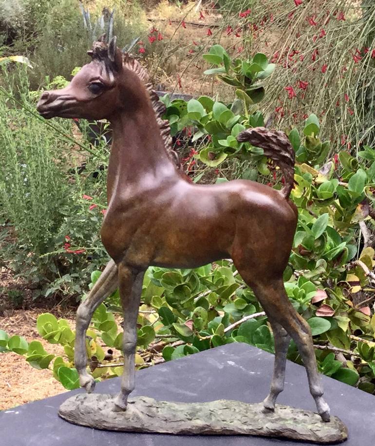 The artist's love of horses inspired this bronze foal sculpture. Detailed, delicate and dynamic this miniature equine sculpture captures the joy and life of new life. A beautiful horse statue this is the ultimate figurative sculpture. Enjoy the love of the horse captured in bronze.