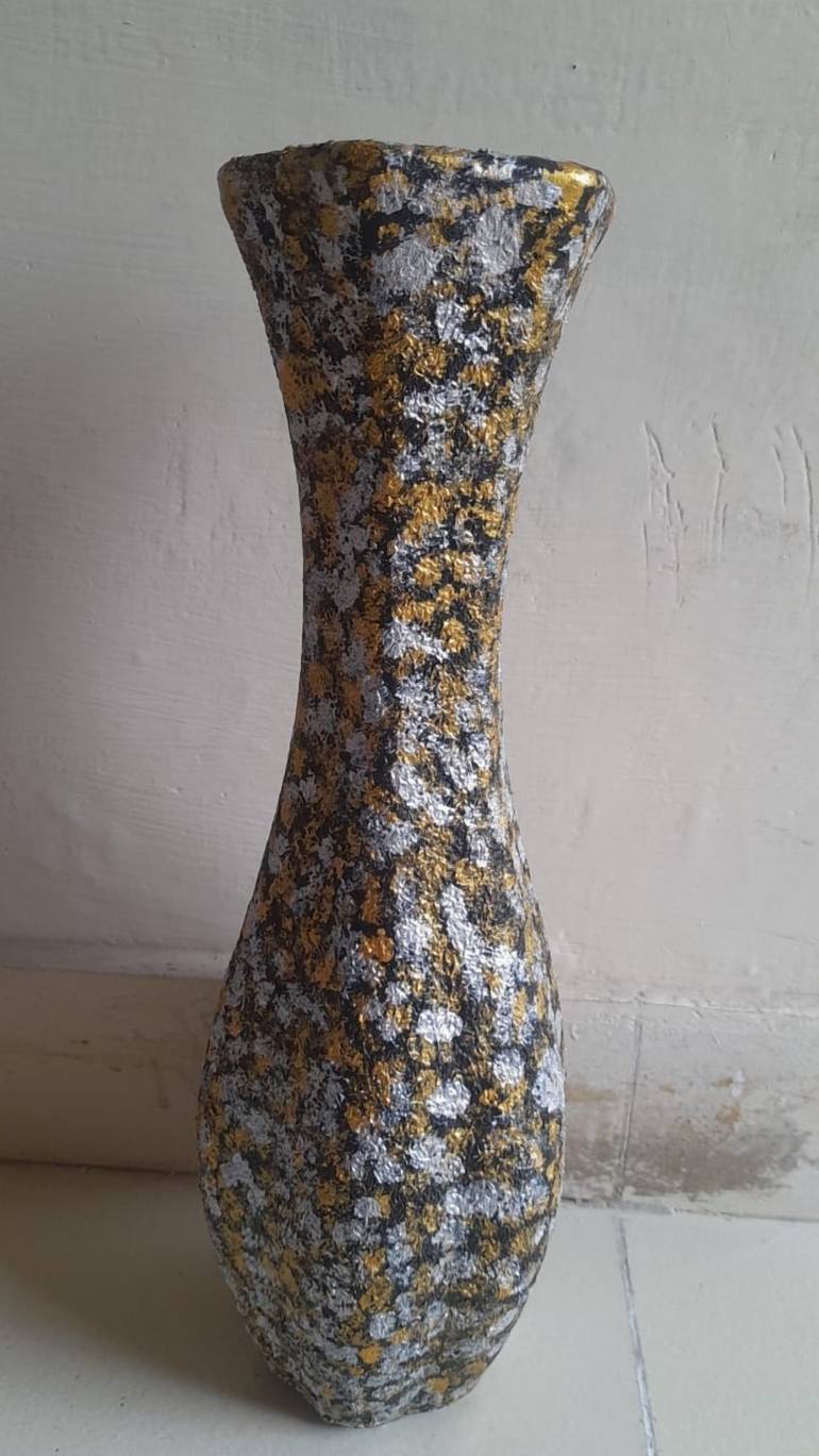 I have prepared this vase with a lot of effort. I have painted it with acrylic colors. You can decorate it in your room. You can put flowers in this vase. I use black, golden and silver color.