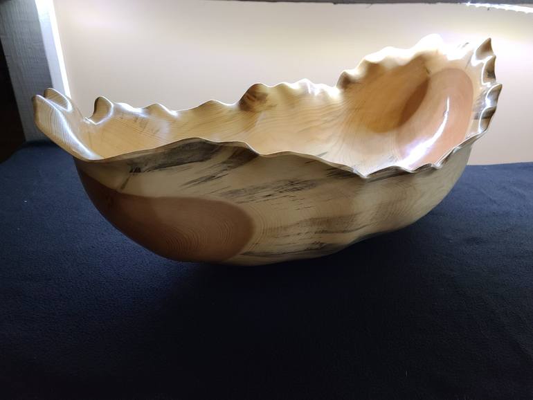I started this bowl using my chainsaw first, allowing me to get pretty creative with my shape and size. I then proceed to use my grinder to get the wavelike patterning. This bowl had a few abrasions, so I filled them with colored epoxy. To bring the bowl into focus I start the sanding process. I fin...