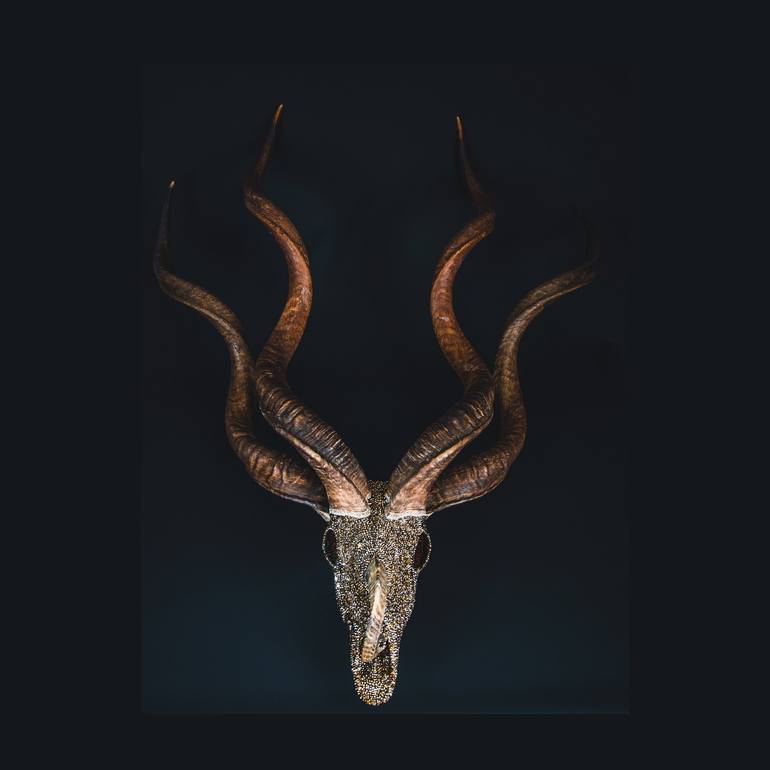 Winner of the Global Art Awards Tokyo 2021! Evolution and the associated selection and mutation fascinates me. Existence itself, the struggle for life, and adaptation to the environment is the theme I unite in my art. I'm spending a lot of time searching for rare original specimens, bone and skull find as the basis for my sculptures. Then I begin to unite the animal world, imagination, and their enemies in art. With the soul gone, the body becomes just an ornament. These objects are reshaped, transformed, and brought back to life, to regain their place as a symbol of the beauty of nature. In the unusual crossings and expressions, the hybrid creatures get their surreal features. I create my vision of how living beings and nature - develop under different environmental conditions - creating a fascinating, mystical world. Light is one of the essential elements of my art. Therefore I combine elaborate craftsmanship with the highest quality materials. Each sculpture is embellished with up to 40.000 Swarovski crystals which are the recurring theme in all my artwork. The crystals create a unique, intriguing presence for each piece adding the dimension of light as one of the essentials of our being: the material to create matter. It elicits millions of facets in a single beam of light. Nowhere is beauty better set in the scene than in nature. I love the aesthetics of nature and playing with light to highlight its beauty, its complexity, and finding beauty in the darkness and the shadows. I like the notion of making the unseen, seen. With my sculptures I’ve been experimenting with the patterns and textures found within the natural world, combining scale and context to create new species that, while being wholly grounded in reality, feel other-worldly.
