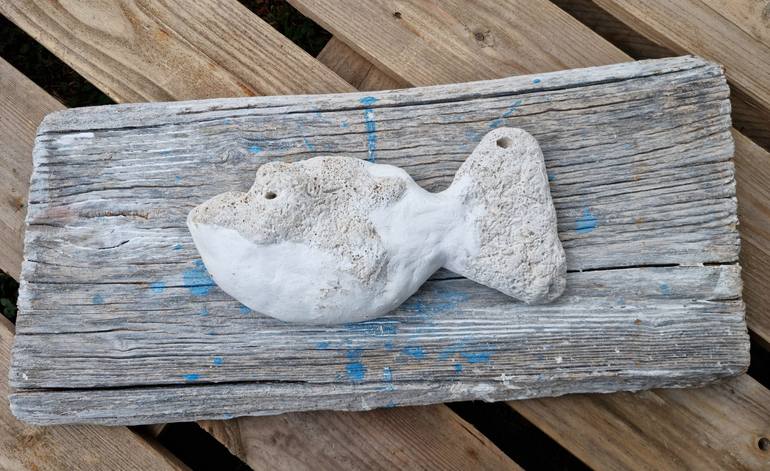 BIG FISH Mixed media : sea stone,old wood,modelling mass,acrylic Dim.: 56 cm W x 26 cm H x 11 cm D You can put-hang on the wall.