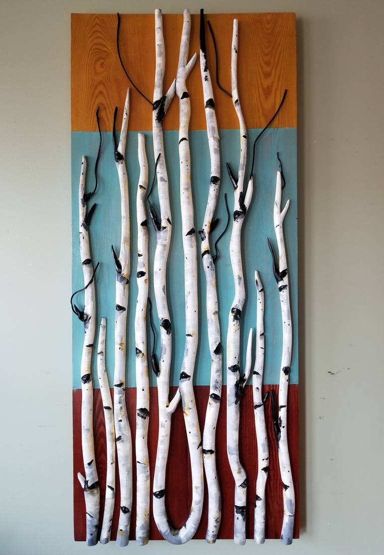 Birch Forest is the fourth in my hand carved wood relief series. This piece was made by plaining a 100 year old re claimed barn wood board down to it's fir core.I then sanded and used 3 different colored stains to create the background for the birch. Each tree was made in pine all hand carved and pa...