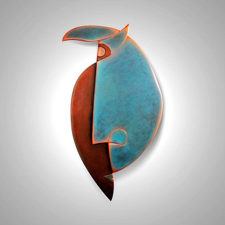 this is a combination between human face & bird shape Refers to the freeing of the mind. MDF wood is the material used to create this artwork & finished with acrylic paint of blue & Brown color with copper metallic touch. Brown : Grounded (human) Blue : Freedom (bird) Copper : History