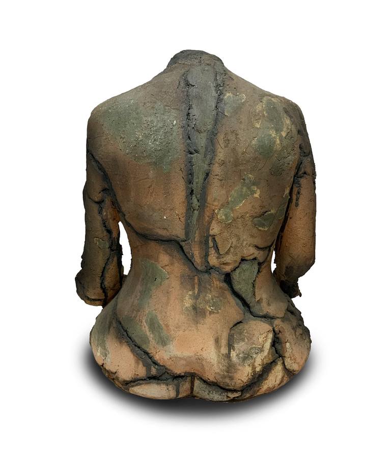 This sculpture depicts a fragmented and textured representation of a human torso, viewed from the back. Made of clay, the surface exhibits cracks, rough textures, and an organic appearance. The earthy tones of brown, green and black give the piece a weathered, almost fossilized look. The form is hig...