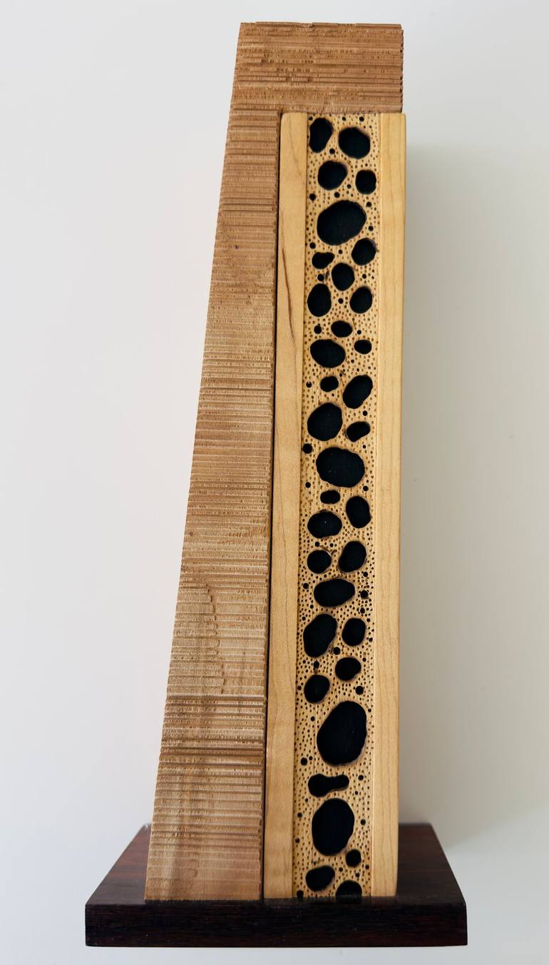This hard birch sculpture is highlighted on the front side by a thin piece of white birch pierced with small dental drills and outlined with free cut patterns running the length of the obelisk. A series of small shallow cuts were made on the surface and on the right side of the piece by a small ban...