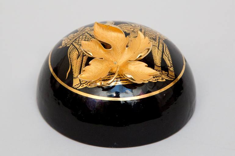 In Ann’s wood and metal juxtapose titled Black and Gold, two waring men on elephants pictured on a black glossy dome are hidden behind a gold leaf which represents nature. In the end, when we are long gone, nature wins. Ann calls her sculptures “juxtaposes”; she creates them by combining objects tha...
