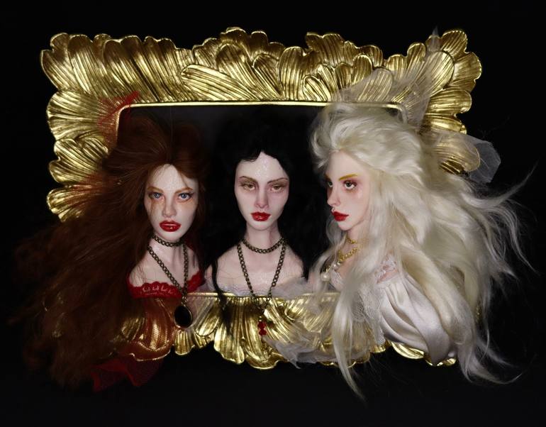 The Blood Sisters are hand sculpted with polymerclay. Every detail is handmade by the artist, including the eyes that are hand painted and inserted during sculping the face. The hair is real mohair wool and the dolls are painted with oil paint that dries in oven. These three vampires sisters are a ...
