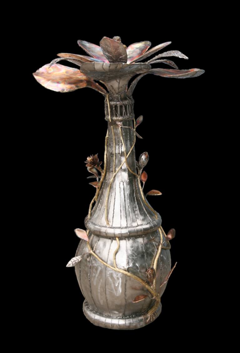 Description: Blooming is a depiction of a vase metamorphosing into a flower. This piece represents a wide array of color using brass, copper, bronze and stainless steel. Blooming won an Award of Merit at the Valley Sculpture Artists 2005 Sculpture Exhibition in Sacramento, CA. This beautiful sculptu...