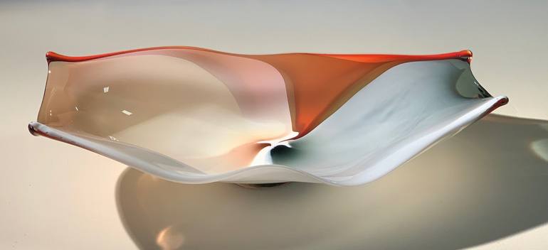 Blown glass perfect for oblong tabletop. Inspired by the geometry of flowers; the center is a focal point of saturated color that radiates out to the squared edges in overlapping layers of transparent and opaque color. The color palette is a serene blending of neutral tones with a vibrant edge.