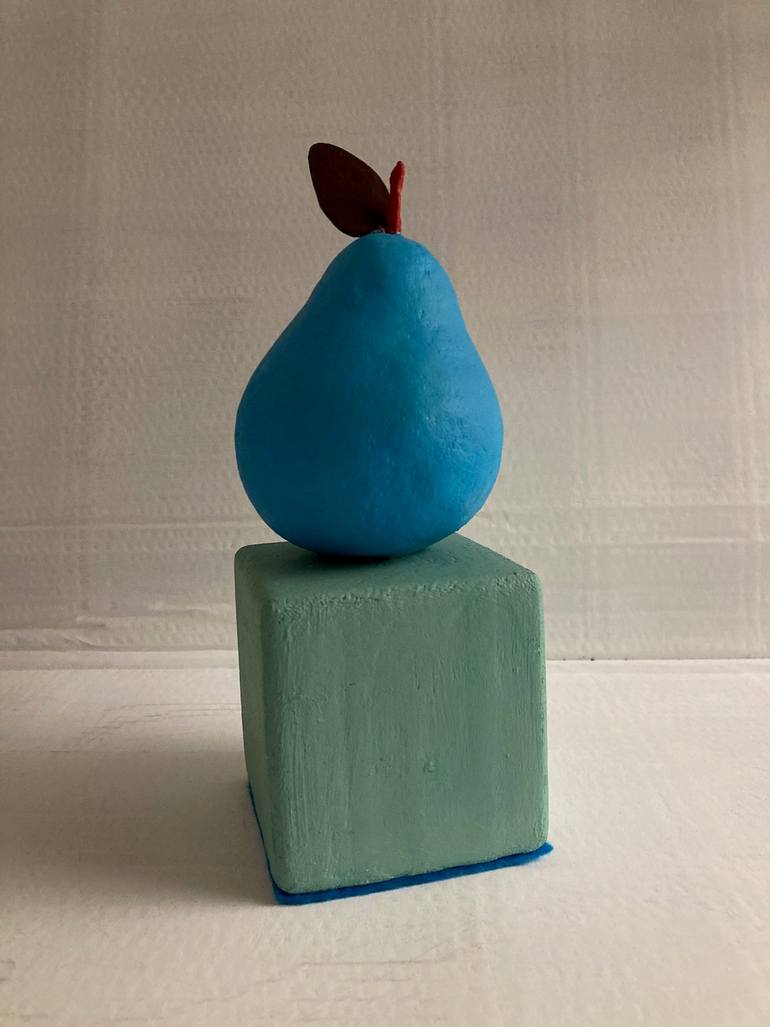 A small 3D interpretation of the painting “Blue” using a mixture of media: clay, gesso, acrylic paint. It is adhered to a wooden base painted with acrylic, the bottom of which has a fibre "mat" Signed on the reverse.