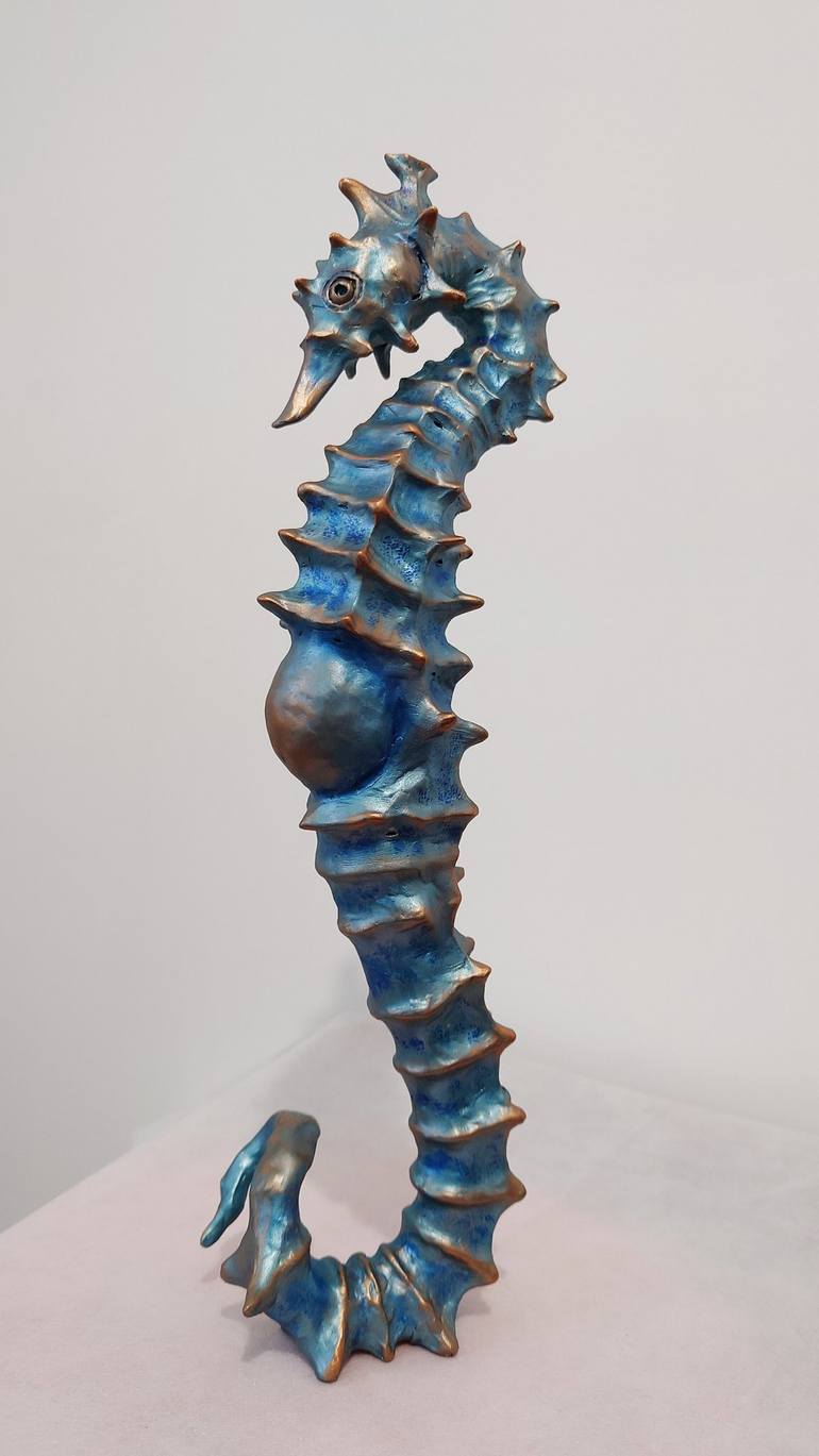 Cool interior seahorse sculpture, will decorate your home in both dark and light colors Sculpture of a blue ceramic seahorse in interior, coated with decorative acrylic paints. A perfect balance has been created so that it can stand on its spikes without a stand