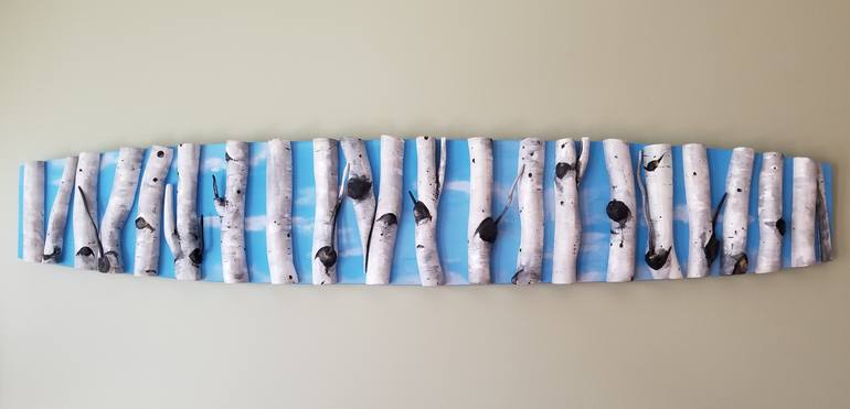 In this work "Blue Sky Birch trees" I have pushed the perspective one step further than previous works. By creating a concave backboard the viewers eye is treated to a more dramatic perspective. Like my other works each tree here Is made by taking 2x6 cedar board drawing out each tree then cutting a...
