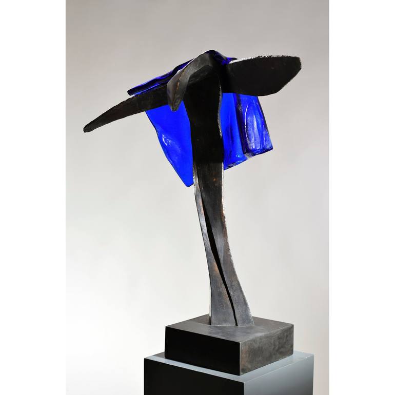 André van der Linden (1945 Amsterdam). André studied for some time at the Rijksacademie in Amsterdam, but is self-taught as a sculptor. He has been working as a sculptor since 1967 and settled as such in Friesland in 1972. Until 1978 André mainly worked in wood, which was sometimes painted in primary colours. Subsequently, a combination of materials was often used. At first wood was combined with stone, until the wood faded into the background and stone sculptures appeared, sometimes in combination with ferrocement. Working with ferrocement, the core of which is an iron construction, eventually led to the fact that the cement was omitted and the stone statue was combined with stainless steel. The white of the steel did not always combine with the idea to be executed, so that the dark bronze was added as a new option. Gradually, the stones disappeared from the statues and there are now combinations of steel and bronze, where glass is often a colorful addition. Over the course of 55 years, there has also been a change in starting points. Initially, images appeared with a mainly inner strength, later a transition was made to a much more sober visual language and in the following period we now see greater expressiveness again, in which what moves and sets the individual in motion is a recurring starting point. . A further abstraction of these moving figures offers the viewer freedom of interpretation. In the words of Huub Mous: Nothing is as obvious on closer inspection as it seems at first. This certainly also applies to the images of André van der Linden. The artist who lives and works in Friesland has built up an impressive track record. Many of his sculptures have been given a permanent place in public space. André van der Linden's work invites reflection. Although the artist derives formal starting points from geometry and stereometry, his images escape cool calculation and law. Additions that seem incongruous at first glance act as counterpoints to constructivist elements. The images derive their visual tension from this duality. During the process of combining and assembling, shaping and deforming, the artist works with contrasts. He gives shape to processes of change, to cycles that determine the natural course of events and to human power and inability to influence them.