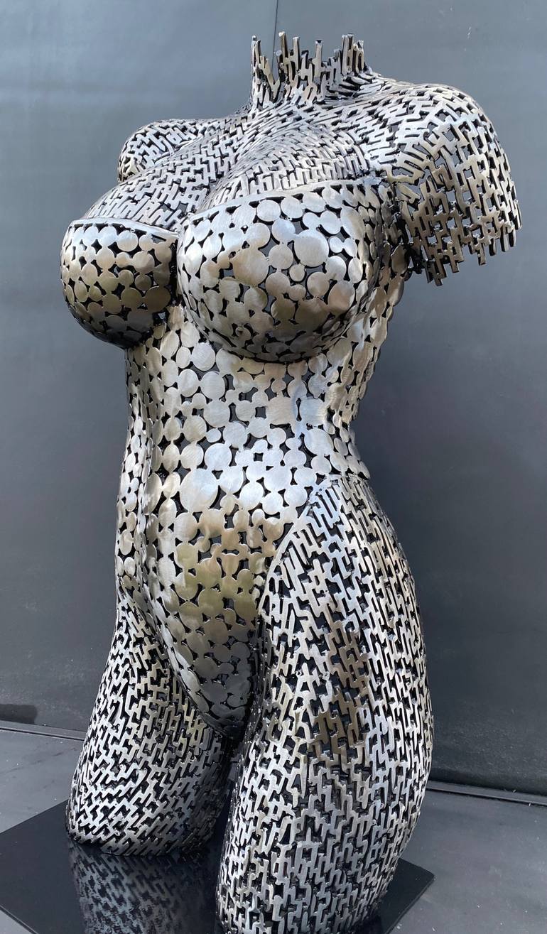 “ Bubbles in the champagne room “ completed 12-31-19 This piece was created by welding around 1000 small steel rods and a couple hundred varied sized steel discs together. It is the first piece where I tried to “clothe” the figure. She stands 34 inches tall x 20 inches wide x 12 inches deep and is...