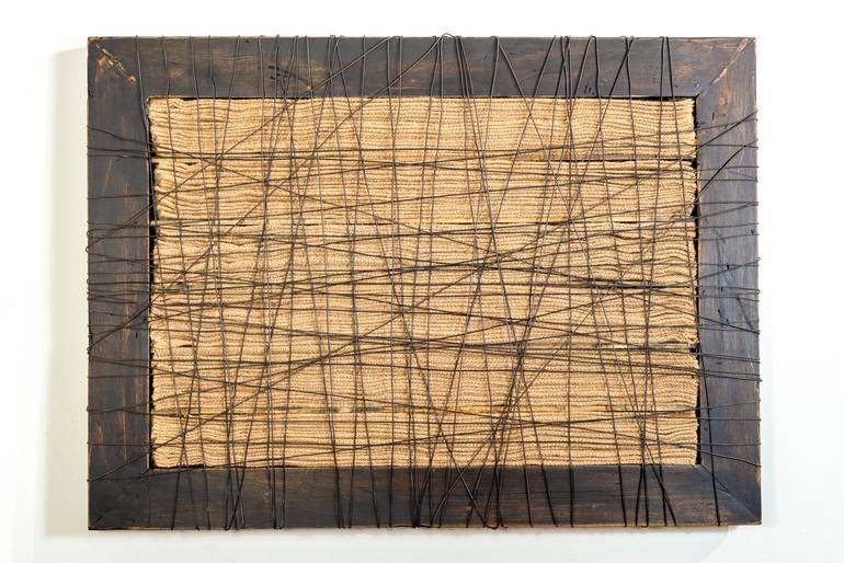 This work is called, "Burlap in Wire" and uses remnants of other projects and found pieces. Handmade wood stained frame around burlap and wrapped with metal fence wire. Wall mounting bracket is included.
