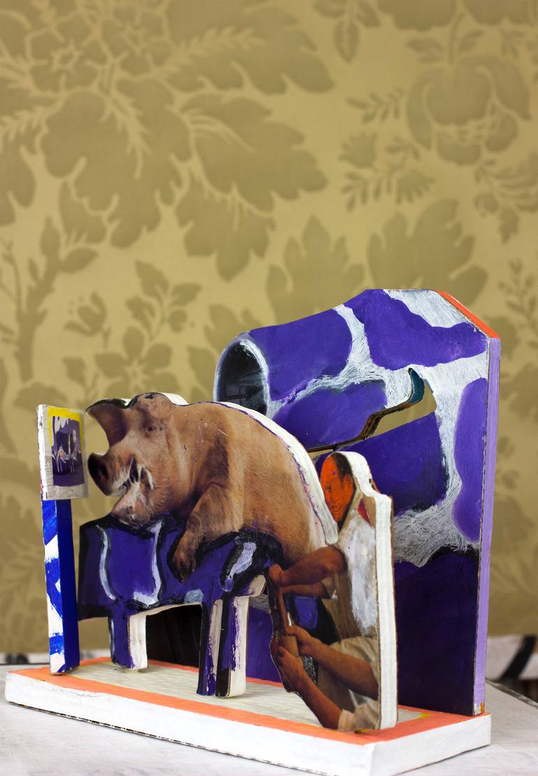 "Business as usual" - narrative sculpture The cardboard surface consists of photo material, works from the project "artrecycle", acrylic paint and is protected by an acrylic varnish. The figurative or abstract forms and their surfaces result in different combinations of forms and different perspecti...
