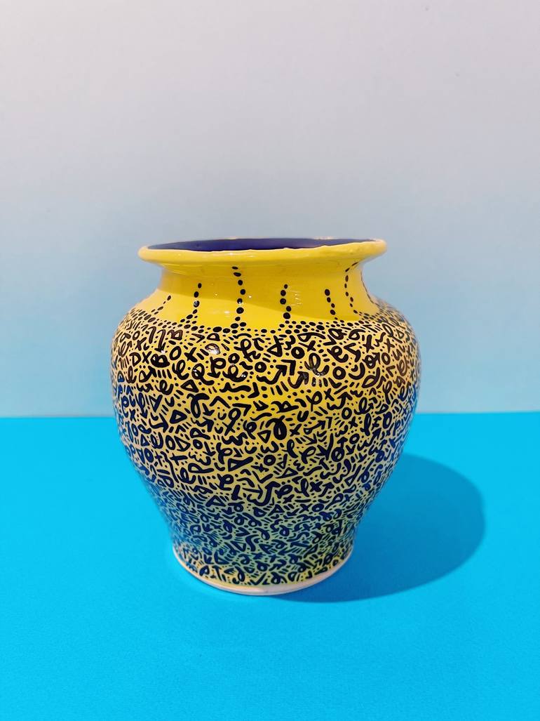 All of my ceramics are a collaborative project with my mother, Angela, who is a ceramicist. She creates all the vessels and I hand glaze them. Then they are fired in our own kiln to the exact temperature necessary. When it comes to my mark making technique, I like to say it's my "brush stroke" (Some...
