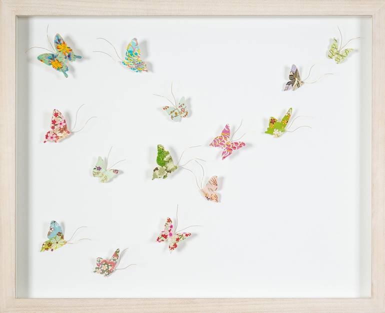 I am an artist specialising in hand cut and painted paper artworks. Drawing inspiration from nature, colour and form, I cut and draw each component by hand, creating joyful artworks that are individual, imaginative and full of movement. My precision and attention to the detail of each component guarantees that every work is unique. I love working with paper as it allows me to be absolutely precise with my incisions, and as my intent is to create movement not only in the subject matter but also within the medium, paper lends itself wonderfully to manipulation so that the birds or the butterflies literally take flight. I use predominantly Japanese chiyogami papers for their vibrant colours and luminescence, as well as Italian fine papers to reflect my heritage.
