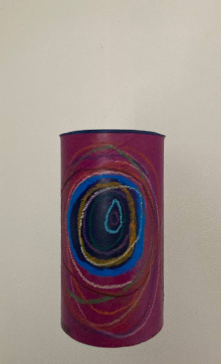 Alexander Calder's mobiles inspired me to create this work. I want the viewer to hear the music and feel the energy it creates. I chose a cardboard container with a plastic lid because of its lightweight qualities and mobility. Hanging hardware is included.