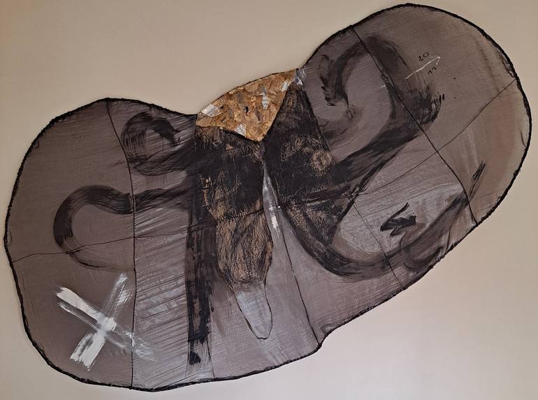 sculpture structure en fil de fer, recouvert de textile brun et moiré ( cousu) avec peinture et bitume et collage papier kraft ( centre) avec golden leaves ( centre top). croix en acrylique blanc. signé derrière et en bas à droite devant. dimensions approx. 120 x 200 x 10 cm souple et très léger. la...