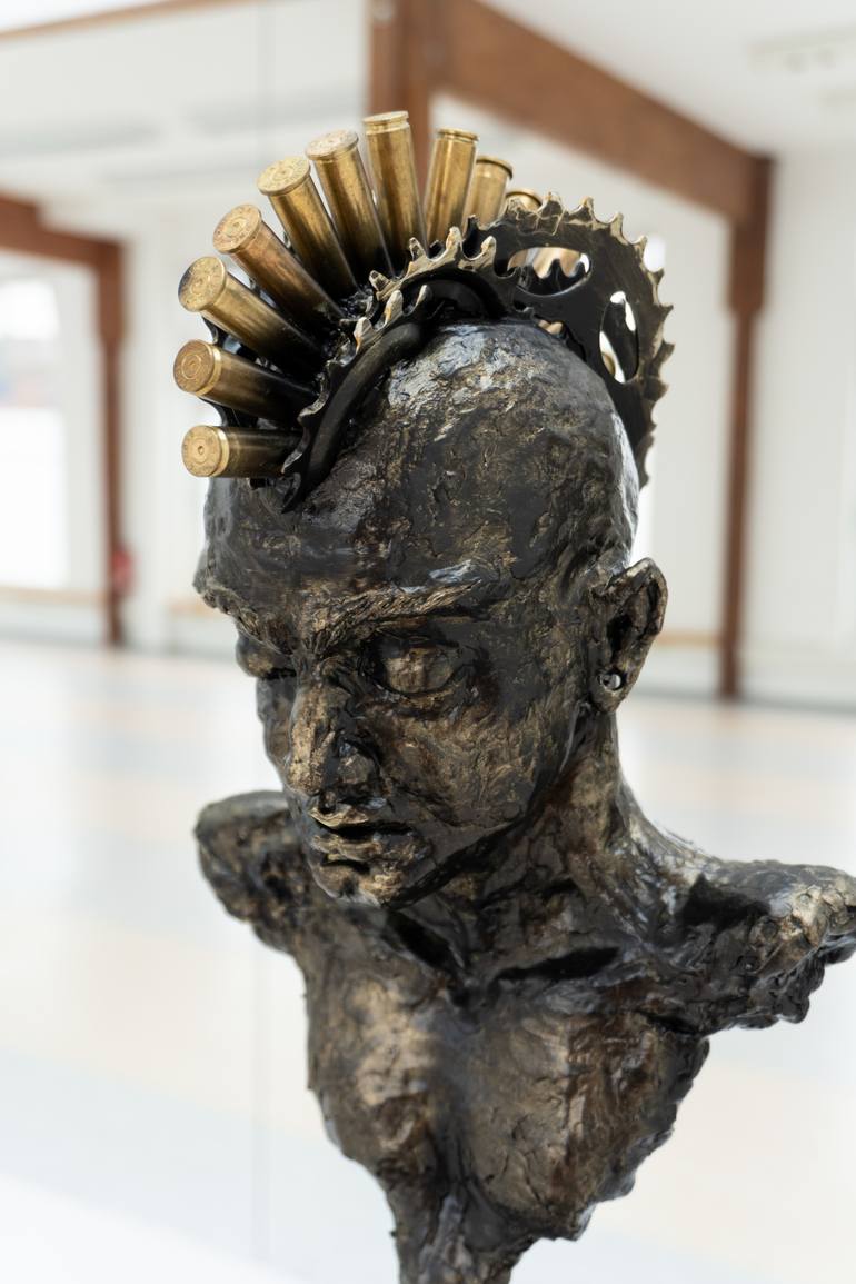 Clay sculpture with integrated metal and wood , painted with acrylic and patinated. 67cm high, 20cm wide, 24cm deep.