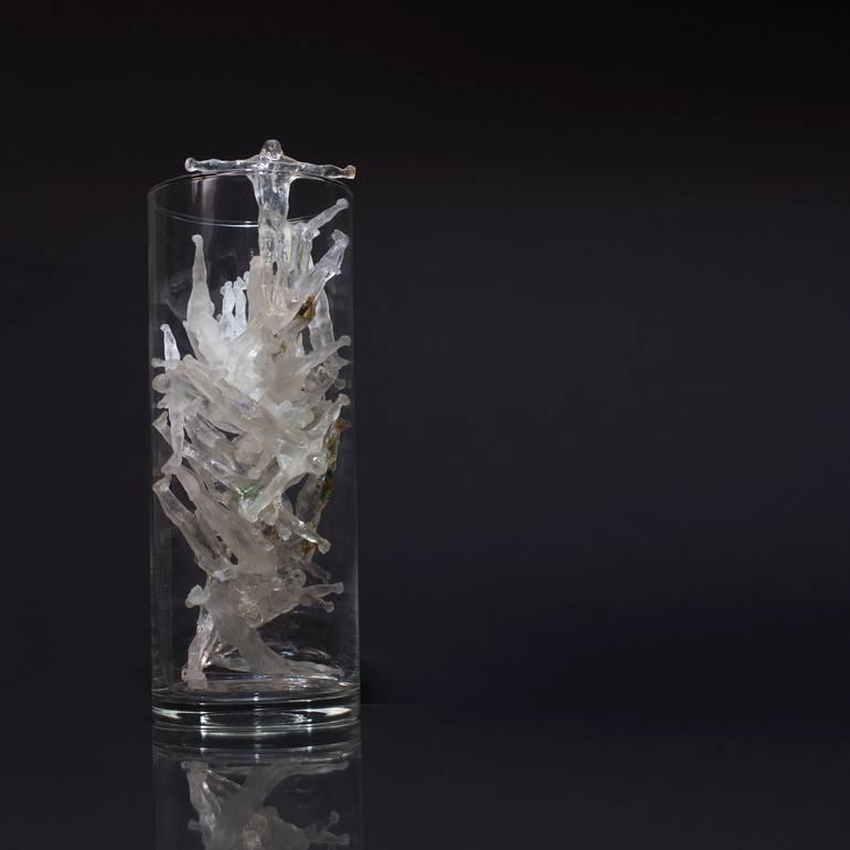 This work is about people who were locked in a glass flask during the beginning of the pandemic. The work is made of epoxy resin and consists of small plastic men, which are in the middle of a glass bulb.