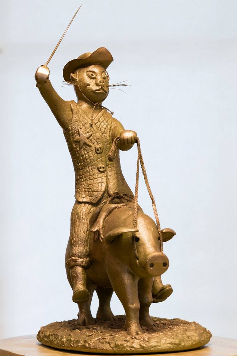 Funny cat sheriff riding the pig to hunting rats. Humorous scene.Reinforced concrete.