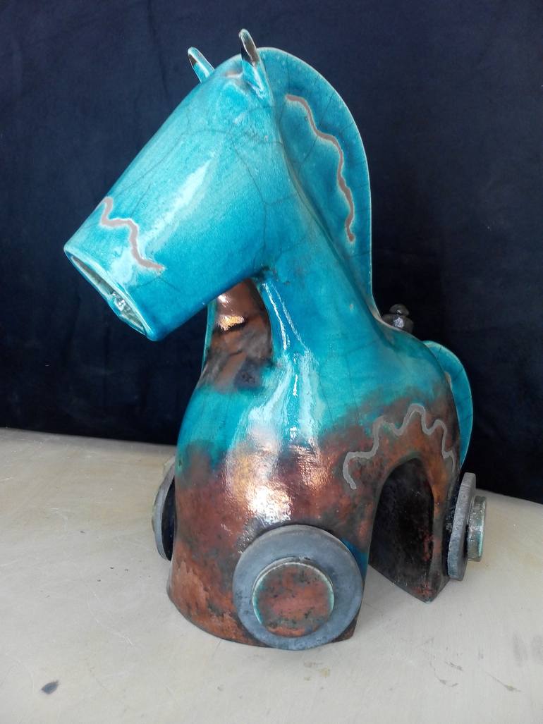 Scultura in ceramica forgiata a mano e cotta con la tecnica RAKU che rappresenta un piccolo cavallo di Troia che nasconde al suo interno un messaggio di pace, stravolgendo l'originale significato di portatore di inganno e guerra. Il contrasto cromatico e la morbidezza delle forme spero possano attir...