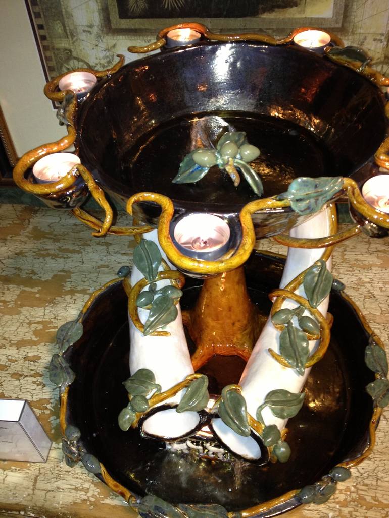 This unique piece creatively enhances the emotional and spiritual feeling of protection. It's upper vessel is surrounded by seven lighted tea candles while water bubbles upward and then cascades down into two ram's horns into the lower vessel. The piece is glazed in ancient gold surrounded by oliv...